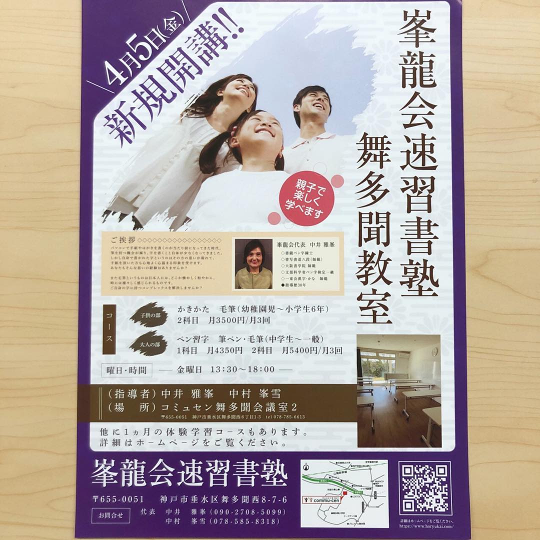 #峯龍会速習書塾 #開講 ・こんにちはコミュセンです本日から、新しいお習字の教室が開講しました️コミュセン入口のラックにチラシも置いてますので、是非ご覧下さい・✩ ⋆ ✩ ⋆ ✩ ⋆ ✩ ⋆ ✩ ⋆ ✩ ⋆ ✩・🖌先生より幼児から大人まで、かきかた・ペン習字・筆ペン・毛筆を基本から学んでいきます。大阪から初めて神戸に開講しました。ここ舞多聞の全ての生徒さんに1人ずつ親切・丁寧・わかりやすいをモットーに指導いたします。✩ ⋆ ✩ ⋆ ✩ ⋆ ✩ ⋆ ✩ ⋆ ✩ ⋆ ✩・・ご興味のある方はまずお問い合わせください・日 時:毎週金曜(月3回)時 間:13:30~18:00場 所:会議室2連絡先:078-585-8318(ナカムラ) 090-2708-5099(ナカイ)〇ホームページ〇https://www.horyukai.com・・・‧✧̣̥̇‧✦‧✧̣̥̇‧✦‧✧̣̥̇‧✦‧✧̣̥̇‧✦‧✧̣̥̇‧コミュセン舞多聞とは…他の投稿→@commucen‧✧̣̥̇‧✦‧✧̣̥̇‧✦‧✧̣̥̇‧✦‧✧̣̥̇‧✦‧✧̣̥̇‧・#コミュセン舞多聞 は#神戸市 #垂水区 の#舞多聞100年の杜 に地域の#コミュニティセンター としてOPENしました。#おしゃれ な街 #神戸 の新しいベッドタウン #舞多聞。#明石海峡 を臨む 木の温もり が心地いい #レンタルスペース です。・様々な#イベント や #習い事 などに使って頂き、地域の皆様の#ライフスタイル がより彩りあるものになりますようにと願いを込めて⋆。˚✩ 。様々な用途に、気軽に使って下さいね(^^♪ 。。☆例えばこんな使い方…#料理教室 #ダンス #リトミック #そろばん #習字 #ヨガ #ストレッチ #講演会 #会議 #空手 #手芸 #コーラス #フリーマーケット などなどその他、皆様の新しい#コミュセン の使い方、大募集です!お問い合わせはこちら↓↓TEL:078-785-6613MAIL:Info@commucen.com