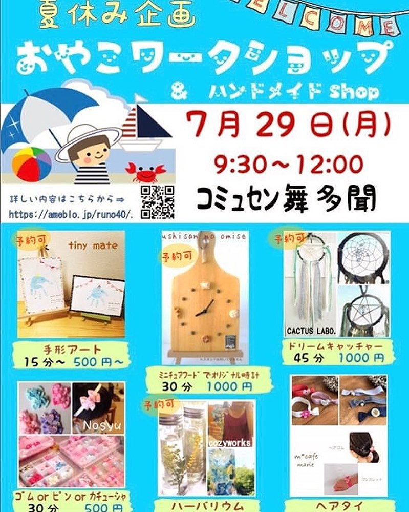 こんにちはコミュセンです・runo+(るのぷらす)さんから素敵なお知らせが届きました・・夏休み『おやこワークショップ』かわいい雑貨が自分で作れちゃう!しかも安い…!これは行くしかありません…・・runo+さんはサマースクールにも登場!7/26(金) 朝10:00~『木の実を使って工作しよう!!』・ご予約承り中ですので、ぜひサマースクールinコミュセンのサイトからweb予約してくださいね・・・手形アート @tiny.mate・ミニチュアフード @ushisan2018 ・ドリームキャッチャー @cactus_labo・カチューシャ @nosyu8・ハーバリウム @cozy.works・ヘアタイ @m.cafe.marie・・‧✧̣̥̇‧✦‧✧̣̥̇‧✦‧✧̣̥̇‧✦‧✧̣̥̇‧✦‧✧̣̥̇‧✧̣̥̇͡° ͜ ʖ ͡° ) what?コミュセン過去の投稿→@commucen‧✧̣̥̇‧✦‧✧̣̥̇‧✦‧✧̣̥̇‧✦‧✧̣̥̇‧✦‧✧̣̥̇‧✧̣̥̇・#コミュセン舞多聞 は#神戸市 #垂水区 の#舞多聞100年の杜 に地域の#コミュニティセンター としてOPENしました。#おしゃれ な街 #神戸 の新しいベッドタウン #舞多聞。明石海峡 を臨む 木の温もり が心地いい #レンタルスペース です。・様々な イベント や 習い事 など様々な用途に、気軽に使って下さいね♬︎皆様のライフスタイルがより彩りある豊かなものになりますように⋆。˚✩ 。・☆例えばこんな使い方…#お料理教室 #ダンス #リトミック #ヨガ #面接 #セミナー #会議 #ハンドメイド #パーティ #コーラス #楽器練習 #フリーマーケット などなどその他、皆様の新しい#コミュセン の使い方、大募集です!・2月からは、#託児ルーム #もりのおうち in コミュセン も併設しています。「ちょっと習い事の間だけ…」「お買い物や美容院、病院に行きたい」「保育園や幼稚園へいく練習に」など、お気軽にご利用下さいね♪。.:*・♬*.*・゚お問い合わせはこちら.゚・*.【TEL】078-785-6613(コミュセン・託児所共用)【MAIL】Info@commucen.com(コミュセン)info@morinouchi.com(もりのおうち)・・#神戸ママ #垂水ママ #神戸っ子