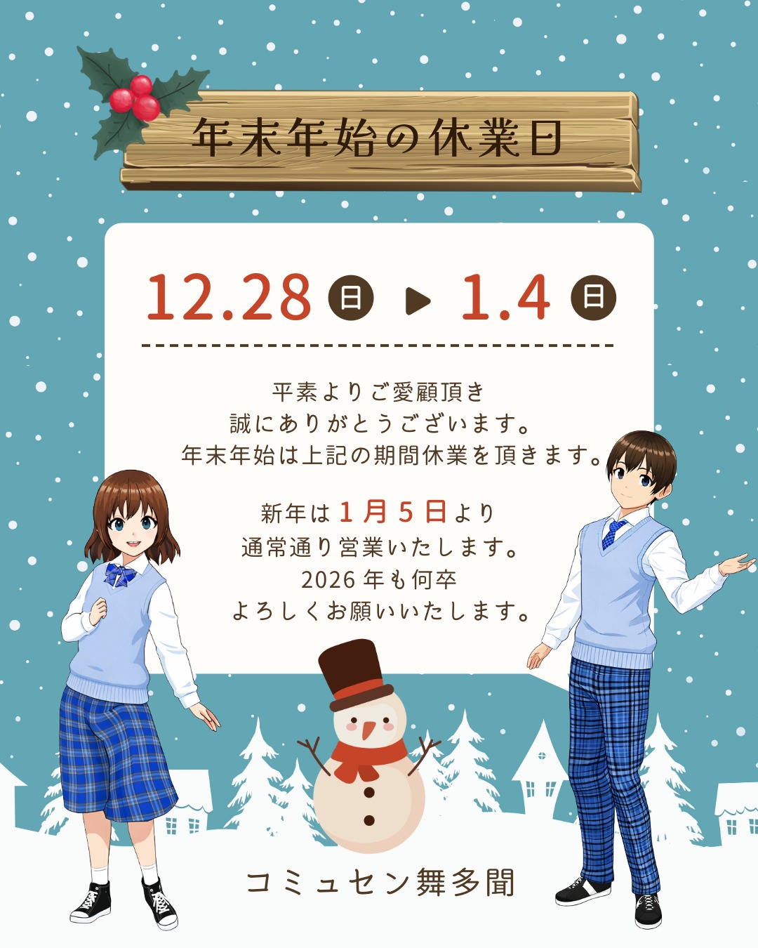 コミュセン舞多聞は、12月28日~1月4日まで、年末年始のお休みを頂いております。